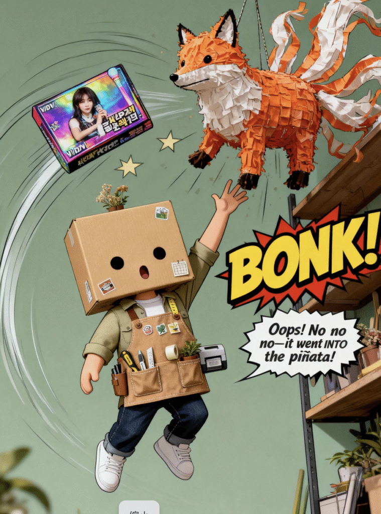 - The Accident: Vidovi stretches to grab it, but his paw slips! The box tumbles through the air and—plop!—falls right into the opening of a large, decorative Piñata shaped like a fox, hanging from the ceiling.