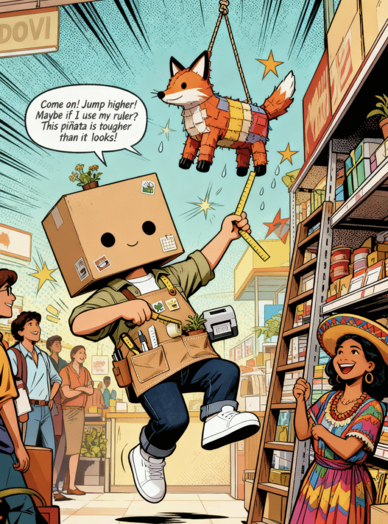 The Accident: Vidovi stretches to grab it, but his paw slips! The box tumbles through the air and—plop!—falls right into the opening of a large, decorative Piñata shaped like a fox, hanging from the ceiling.
