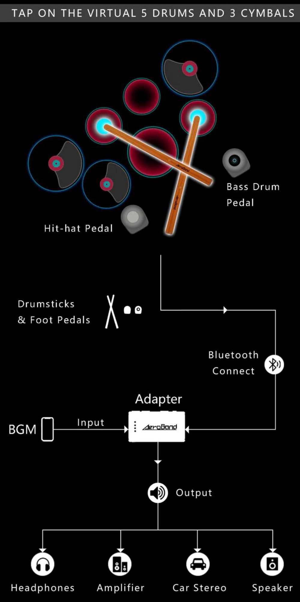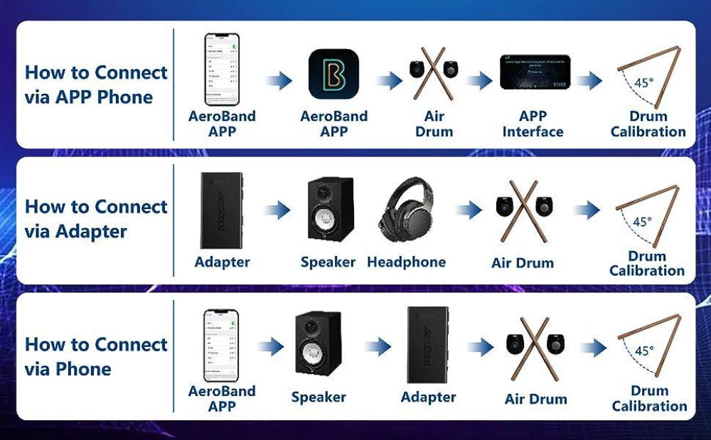 - Power on the air drumsticks and the pedals, and connect drum sticks and pedals via bluetooth in the AeroBand App