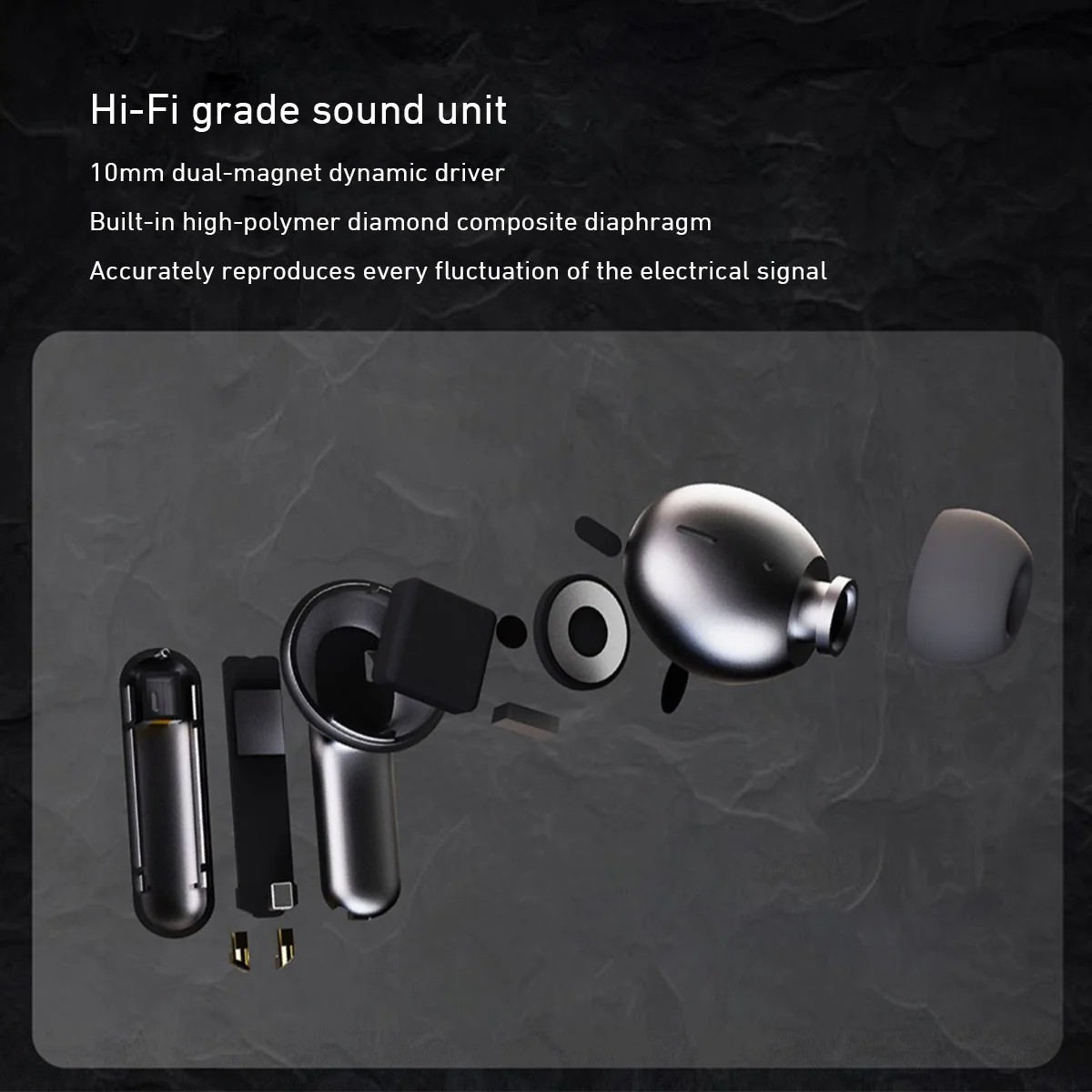 6-10mm voice coil driver with CD-quality high-bitrate audio transmission;
