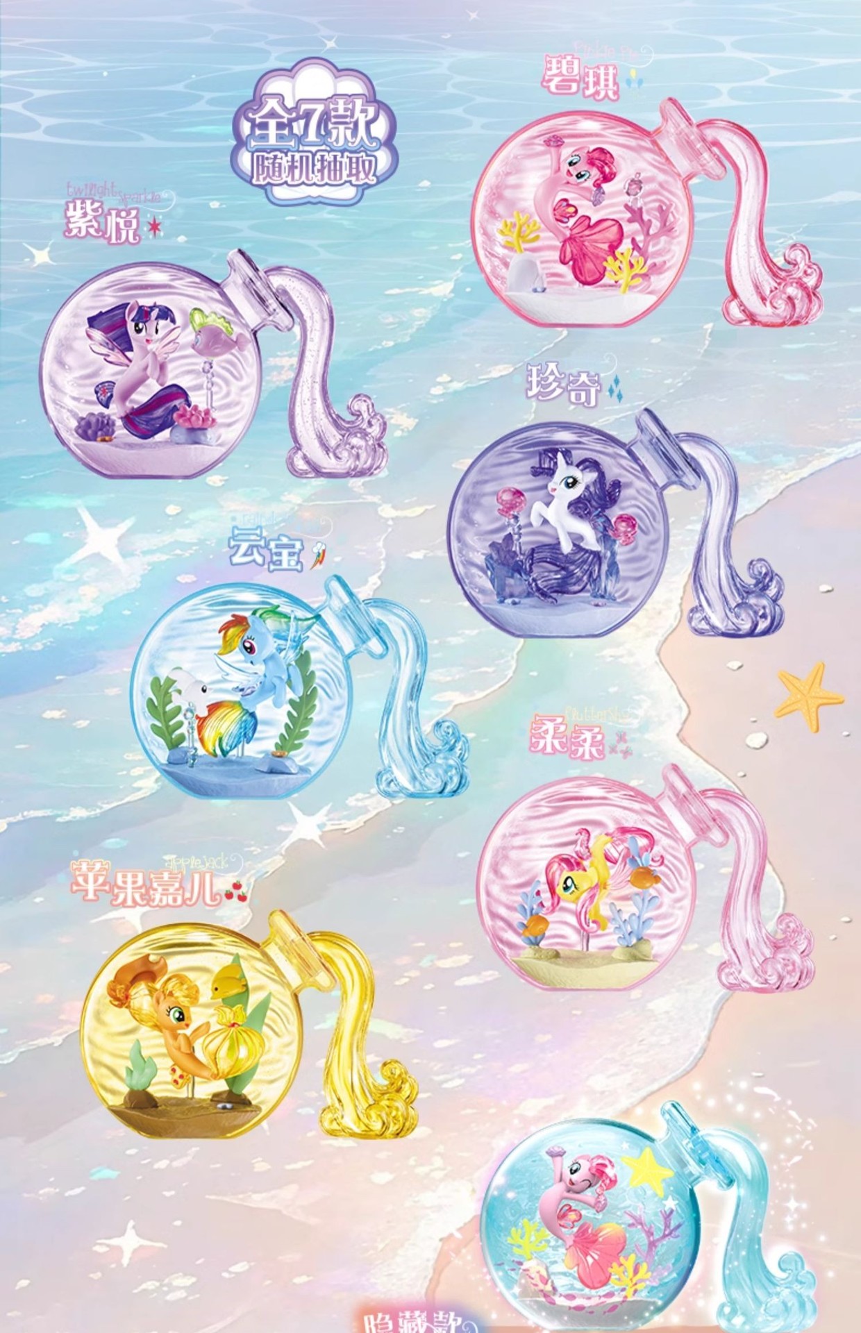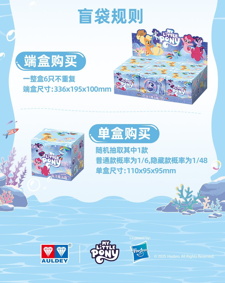 Official My Little Pony Ocean Magic Bottle Blind Box by Auldey, licensed by Hasbro. Collect 6 adorable mermaid-style ponies inside whimsical underwater-themed magic bottles! Perfect for fans, collectors, and kids aged 3+.