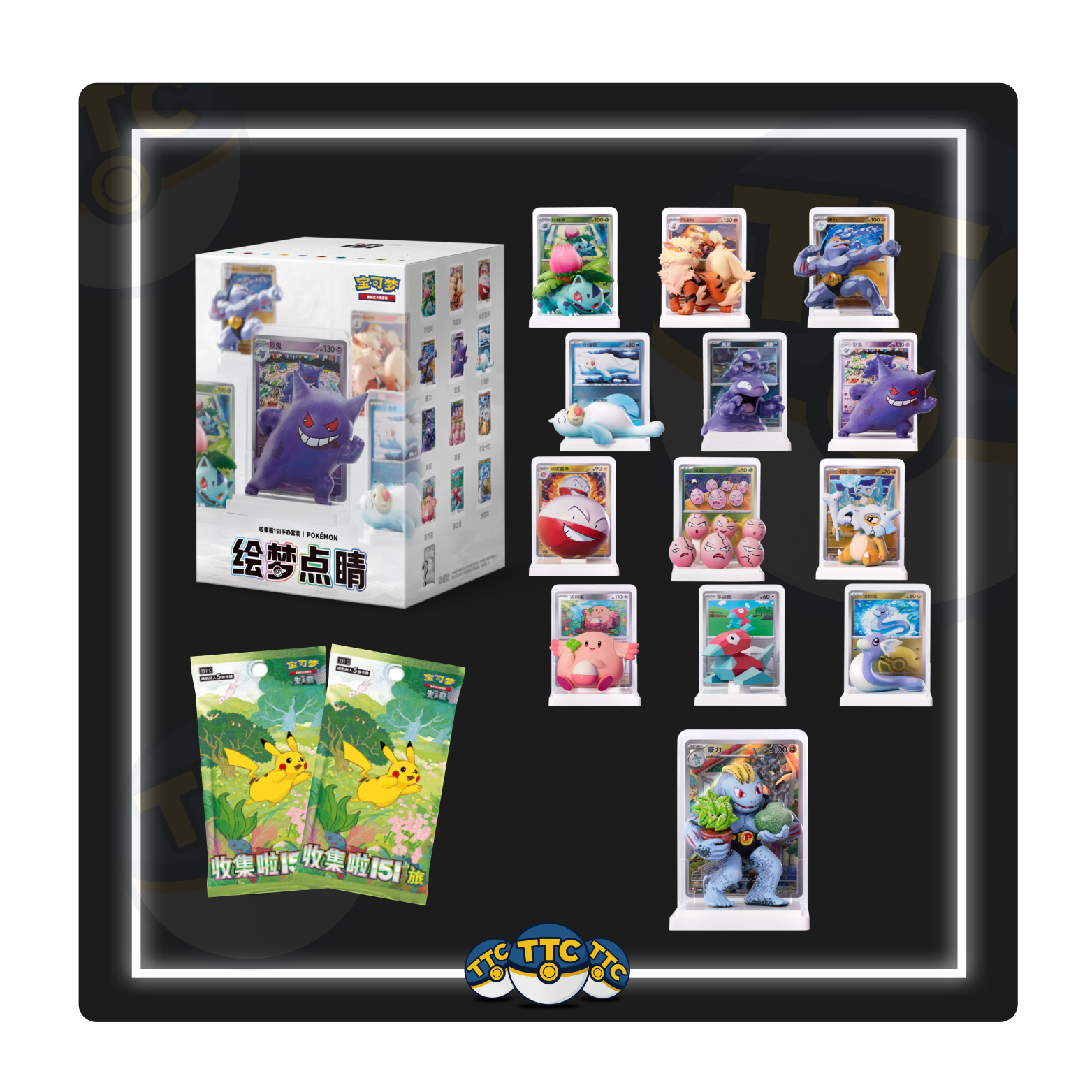 1x Pokemon figure with stand 1x Pokemon holo card matching with the stand with sleeve 2x Slim booster packs of Collect 151 Journey (5 cards inside each pack)