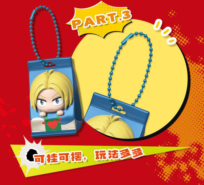 Each pack contains 1 random mini character figure, 1 matching sticker and 1 bead chain for hanging as keychain.