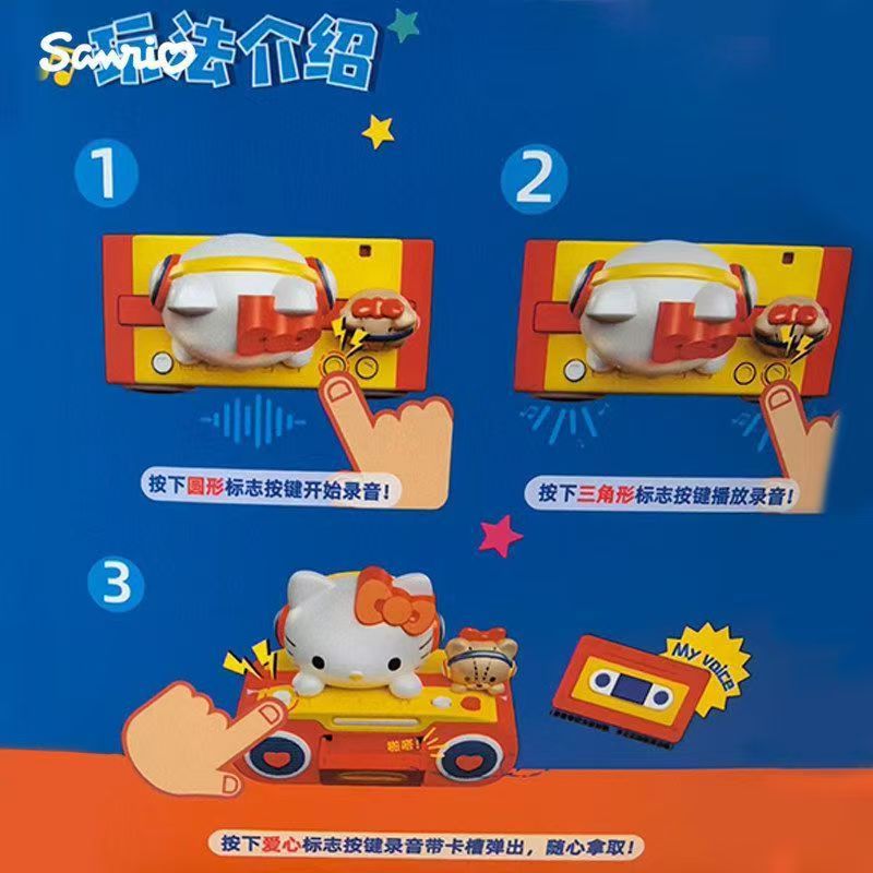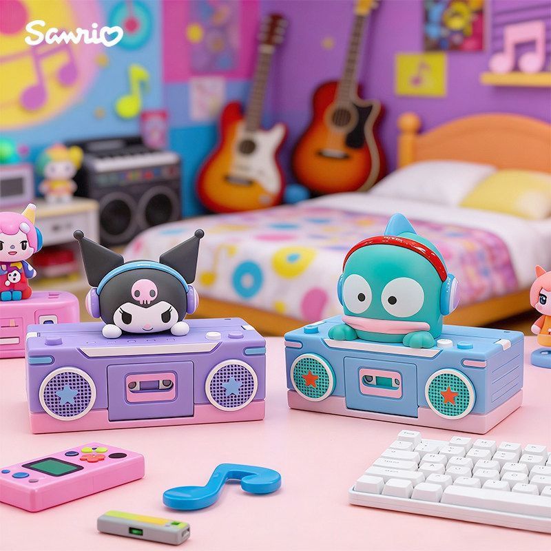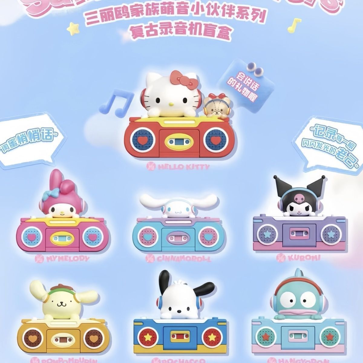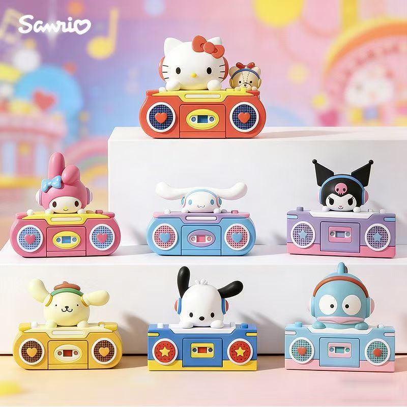This adorable blind box collection brings your favorite Sanrio characters to life as mini retro cassette recorders! Each character sits atop a vintage-style boombox, complete with working buttons and a charming nostalgic design. A full case contains 6 unique blind boxes, featuring Hello Kitty, My Melody, Cinnamoroll, Kuromi, Pompompurin, and Pochacco (or Hangyodon, subject to assortment).