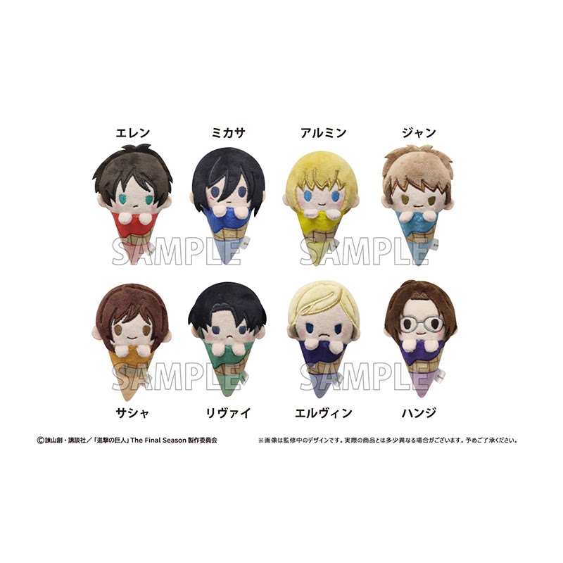 Official licensed Attack on Titan plush blind box by Tapioca, featuring 8 unique character designs in ice cream cone style.