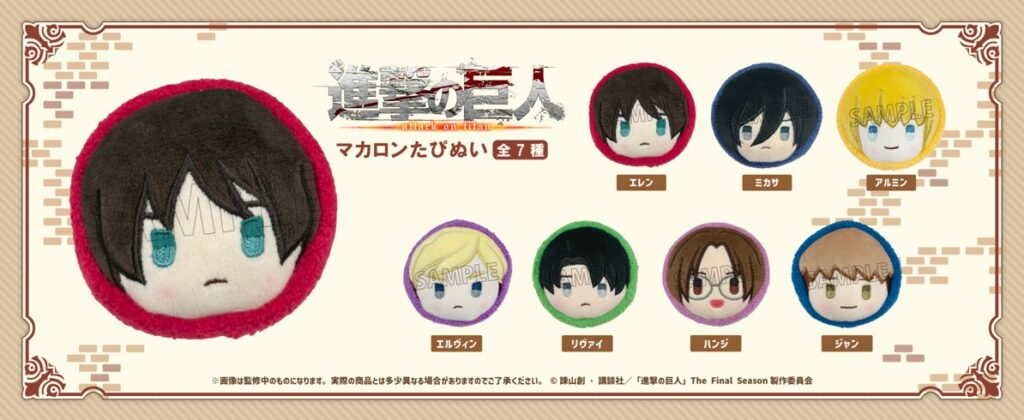 Official licensed Attack on Titan plush blind box by Tapioca, featuring 7 adorable macaron-shaped character designs. Made of high-quality soft
